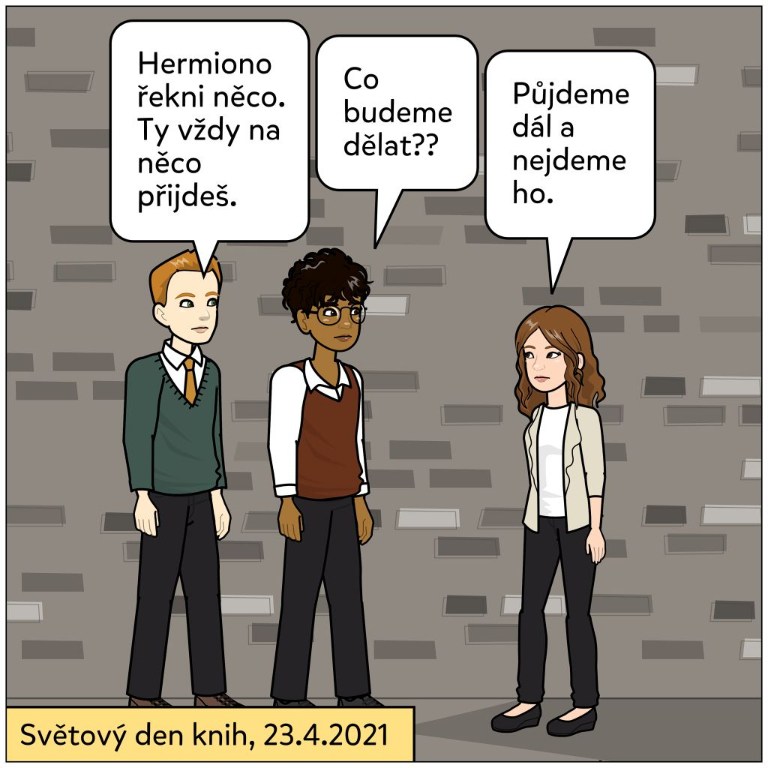 Dne 23. 4. 2021 jsme si připomněli Světový den knihy. Osmáci si v rámci českého jazyka zkusili pracovat v programu Pixton edu a ztvárnili pro vás své oblíbené knihy. Zkusíte uhodnout, jaké knížky jsou u nich na seznamu těch nej?