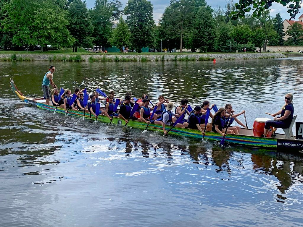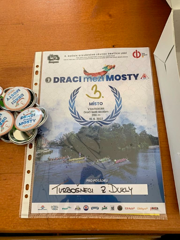 Společnými silami se nám povedlo realizovat den plný zážitku na vodě. Velké poděkovaní patří CB Dragons, z.s. -Dragon boat team, který nám připravil celý den jízdy na vodě za zvuku bubnu. Žáci si v rámci tělesné výchovy vyzkoušeli trénink na dračí lodi. Tréninkově si zajela i skupina žáků osmých a devátých tříd, která se nazývala Turbošneci. Tato skupina dostála jménu a v pátek mezi mosty na Vltavě vybojovala nádherné bronzové umístění. Velká gratulace a poděkování patří nejen žákům, ale také CB Dragons, z.s.- Dragon boat, kteří nám umožnili nádherné dny na vodě.