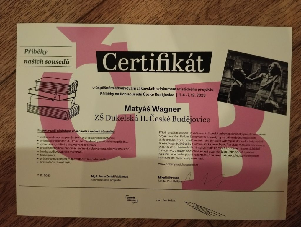 7.12.2023 se v Českých Budějovicích konala závěrečná prezentace projektu Příběhy našich sousedů, ve kterém naši školu reprezentovali žáci 8.B Matyáš Wagner, Michael Valenta a Tomáš Hnilička. Náš tým měl za úkol hledání pamětníka, zpracování otázek k jeho životu, natočení rozhovoru a následně si tým zpracoval svůj příběh pamětníka do krátkého animovaného videa. Techniku animace si kluci vyzkoušeli na workshopu v Českém Krumlově, který vedl animátor Ondřej Nový. V prosinci nakonec prezentovali svoji několikaměsíční práci na slavnostním večeru, kde se představily i další 2 týmy ze středních škol a jeden skautský oddíl. Na první fotografii je tým ZŠ Dukelská s pamětníkem Janem Novotným při závěrečné prezentaci.