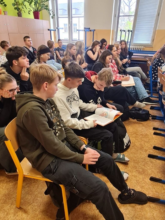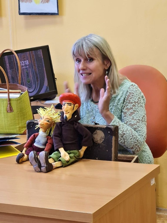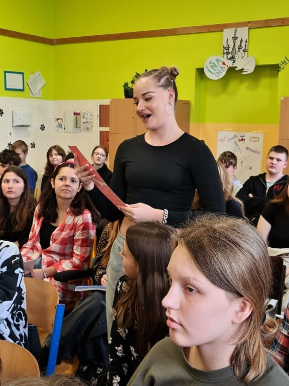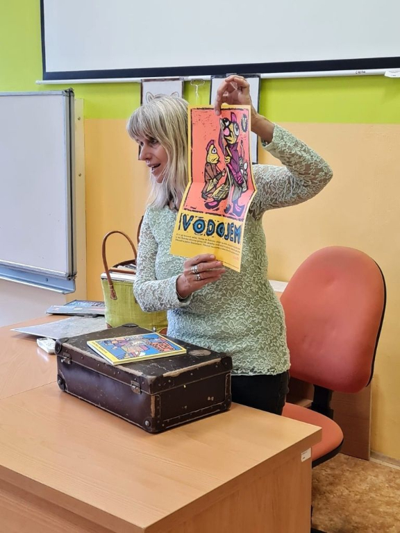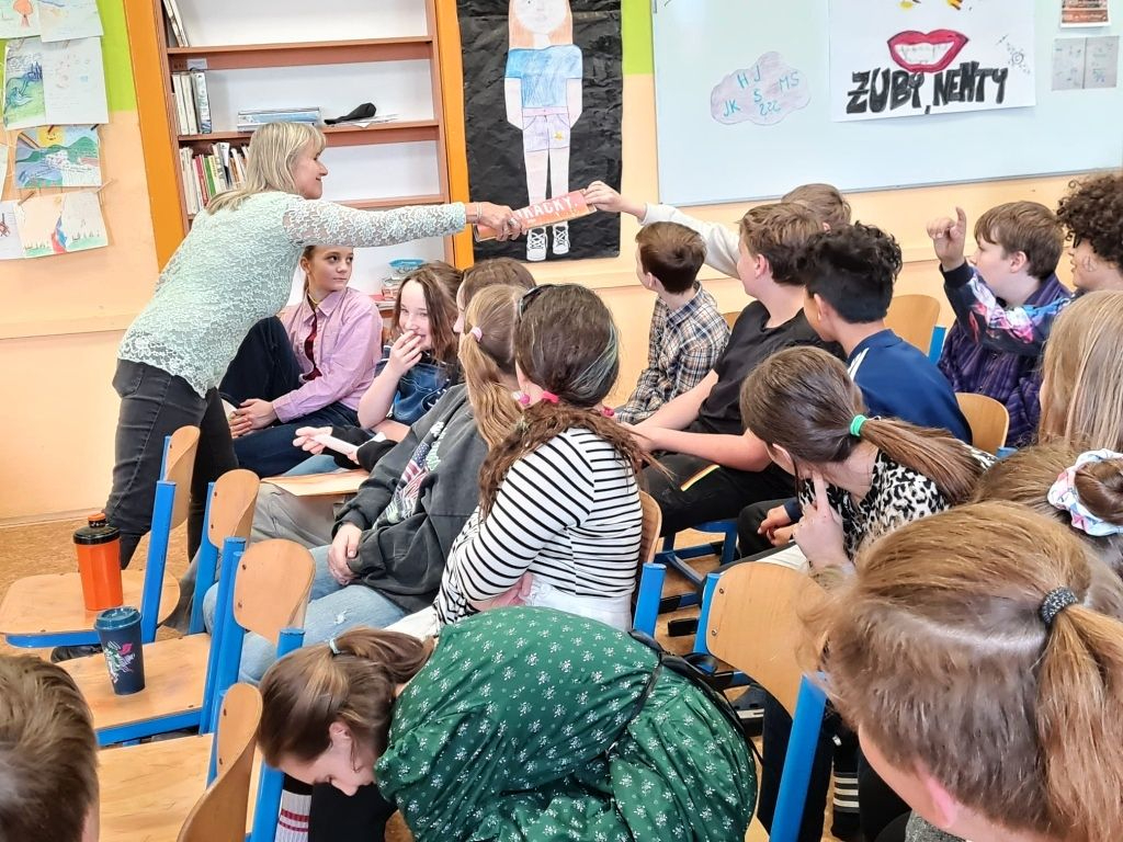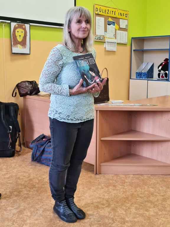 A právě povídání o její knižní tvorbě bylo pro dvě třídy z našeho 2. stupně náplní dvou vyučovacích hodin. Byť beseda byla pro jednu osmou a šestou třídu, to své si tam našel každý. Osmáky nejvíce zaujalo její vyprávění o životě a cestě k herectví, psaní a vlastní kapele. Šesťáky zase zaujalo loutkové divadlo, které si pro nás Marka přichystala na demonstraci své nejnovější knihy Kabát a kabelka, která v roce 2022 získala cenu Magnesia Litera.