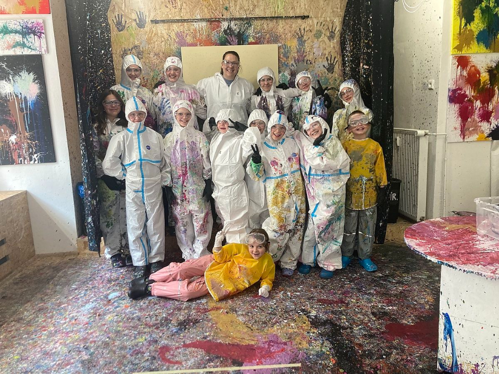 Děti tvořily společné dílo na velké stěně, a to velmi neobvyklým způsobem – pomocí balónků plných barvy a barevných šipek. Každý hod, každý zásah proměnil plátno v originální výbuch barev, kde nic nebylo předem dané a všechno se tvořilo spontánně. Atmosféra byla uvolněná, hravá a tvořivá – děti si vyzkoušely, jaké to je malovat celým tělem a nechat barvu mluvit sama za sebe.
