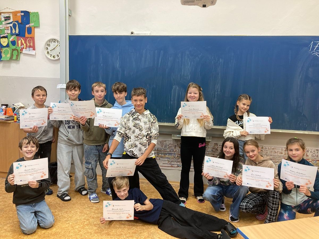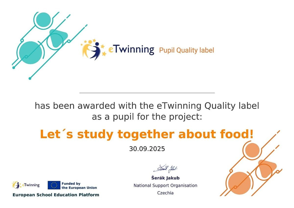 V minulém školním roce jsme se v rámci výuky anglického jazyka ve 4. ročníku poprvé zapojili do mezinárodního projektu eTwinning, na němž jsme spolupracovali s partnery z Řecka, Itálie a Polska. Náš projekt s názvem Let´s study together about food si kladl za cíl propojit výuku s tématy z běžného života. Žáci na základě průzkumu zjistili, které druhy pizzy a sendvičů jsou nejoblíbenější mezi jejich spolužáky a také u žáků v partnerských školách. Navzájem si vyměnili informace o typických jídlech ve své zemi a vyzkoušeli si práci s digitálními technologiemi.