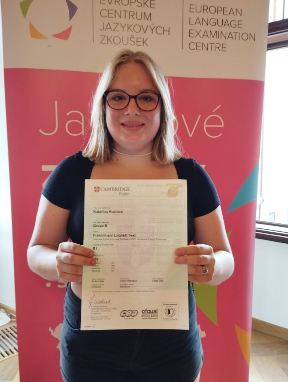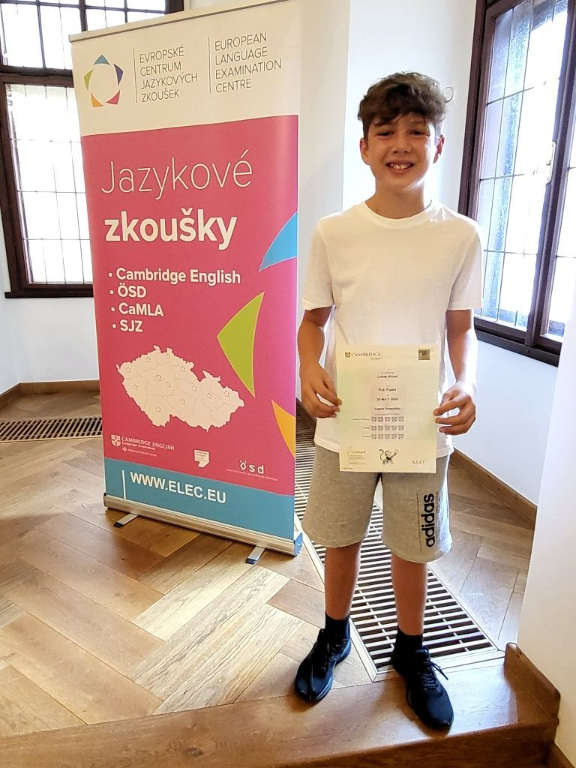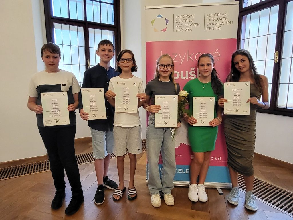 První školní den se v obřadní síni českobudějovické radnice konalo slavnostní předávání certifikátů za úspěšné složení zkoušek Cambridge English. Naši žáci obdrželi certifikáty v kategoriích Movers, Flyers a Key. Loňská absolventka 9. ročníku Kateřina Kozlová získala certifikát B1.