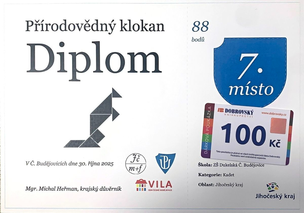 Naši žáci se v silné konkurenci neztratili – naopak dosáhli skvělých výsledků a umístili se na předních příčkách celkového hodnocení. Za své výkony získali ocenění ve formě diplomu a poukazu do knihkupectví, který mohou využít na nákup knih nebo vzdělávacích materiálů podle vlastního výběru.