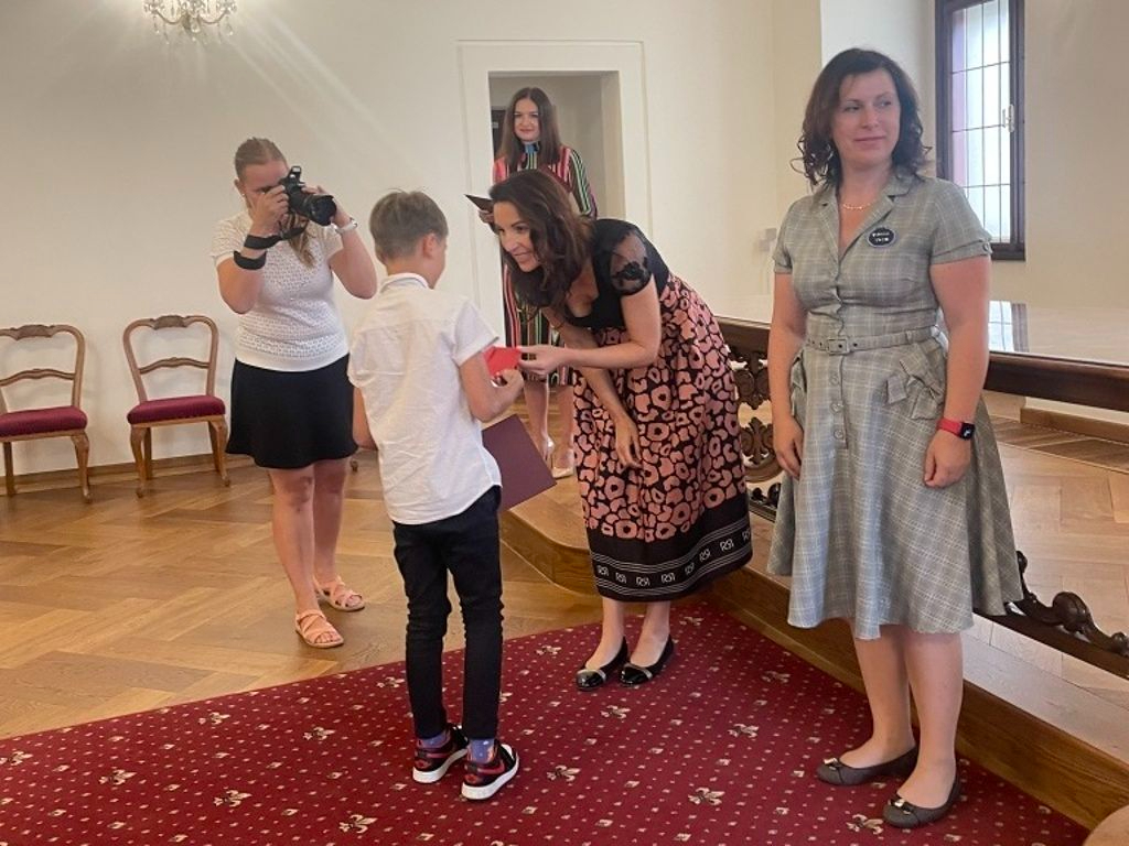 Slavnostní setkání úspěšných žáků českobudějovických škol s primátorkou města D. Škodovou Parmovou. Oceněný byl Zdeněk Koubek 2.C, mistr světa v bike trial.