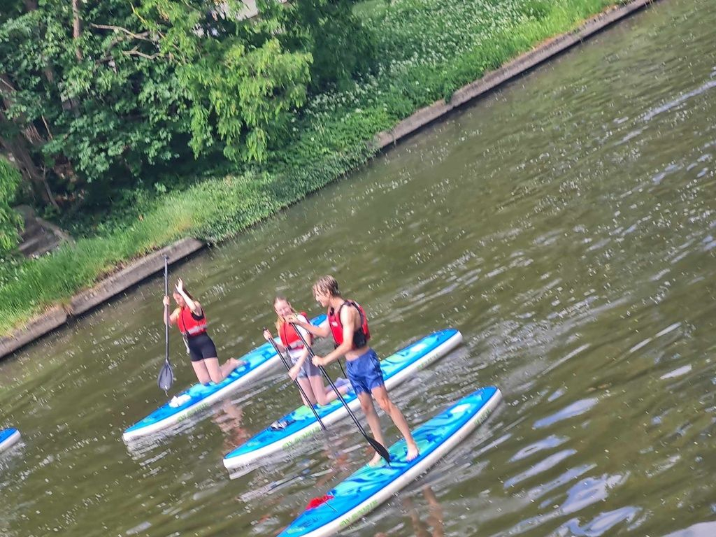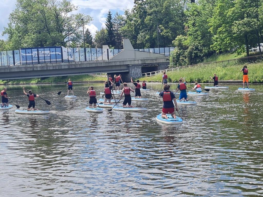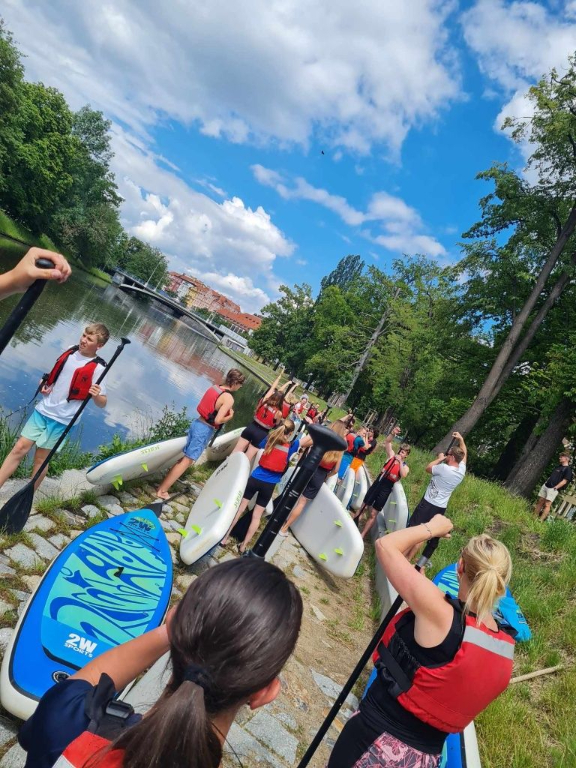Děti si užívaly cvičení na vodě a zkoušely různé pohyby a triky na paddleboardech. Tento netradiční přístup k tělocviku je bavil a zároveň posiloval jejich rovnováhu a obratnost. Byla to skvělá zábava a zároveň skvělý způsob, jak se udržet ve formě. Na výuku přispívá zřizovatel Magistrát České Budějovice.