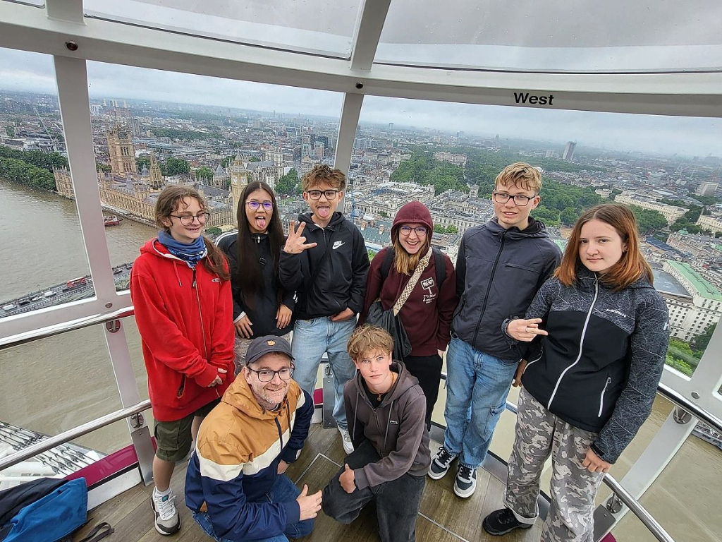 Vyvrcholením zájezdu byl, samozřejmě, Londýn. I přes nevlídné počasí jsme se projeli po řece Temži, viděli nultý poledník, a celé město jsme si prohlédli z výšky z London Eye. Nezapomněli jsme ani na genius loci celého Londýna, Big Ben. Zamávali jsme jejímu veličenstvu králi Karlu III. přes okna Buckingham Palace, nakoupili na Leicester Square a projeli se londýnským metrem.