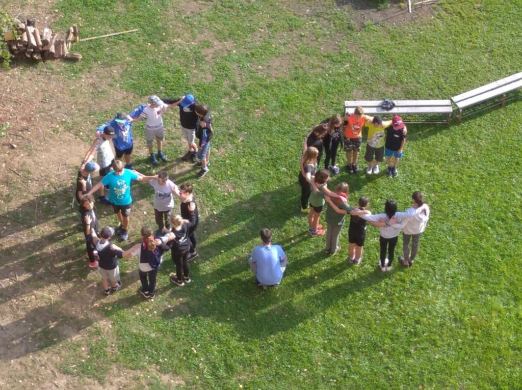 Po úvodním seznámení s programem a prohlídce areálu jsme se pustili do třídních seznamovacích her a her na utužování kolektivu. Každá si zvolila trochu jinou, a tak na hřišti před intrem bylo hodně živo.